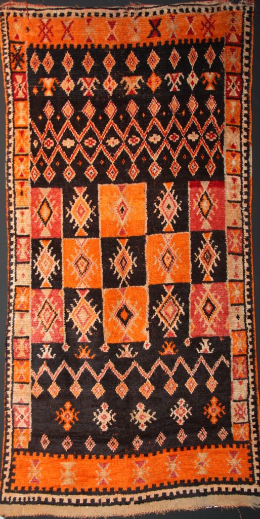 Leurs tapis sont très différents cependant de ceux du moyen Atlas et du Haut Atlas aussi bien du point de vue de la facture qu’en ce qui concerne la décoration. On aurait donc pu supposer qu’il fallait plutôt les rattacher à des traditions bédouines arabes. Si on peut décélérer quelques réminiscences du tapis moyen-oriental, ce sont cependant les différences par rapport au tapis du Moyen-Orient qui saute aux yeux. Plus que l’originalité, c’est souvent l’étrangeté des compositions qui nous frappent. Les conditions historiques, géographiques et climatiques dans lesquelles vivent ces populations doivent y être pour beaucoup. La précarité de l’existence se traduit ici par des essais individuels d’organiser l’espace donnant lieu à des créations étonnantes. Parfois tout le problème semble être de créer des lieux significatifs dans un espace uniforme. Sur un fond uni s’inscrivent alors des symboles dont on pourrait encore vérifier la signification dans le cadre d’un institut de recherche. Une éventuelle influence soudanaise pourrait alors être vérifiée également où le rouge domine parfois à tel point qu’il constitue la seule nuance de tapis généralement parsemés de motifs plus ou moins commandés et polychromes dans lesquels on reconnaît parfois des architectures bizarres, à forme humaine ou animale plus ou moins étranges.
