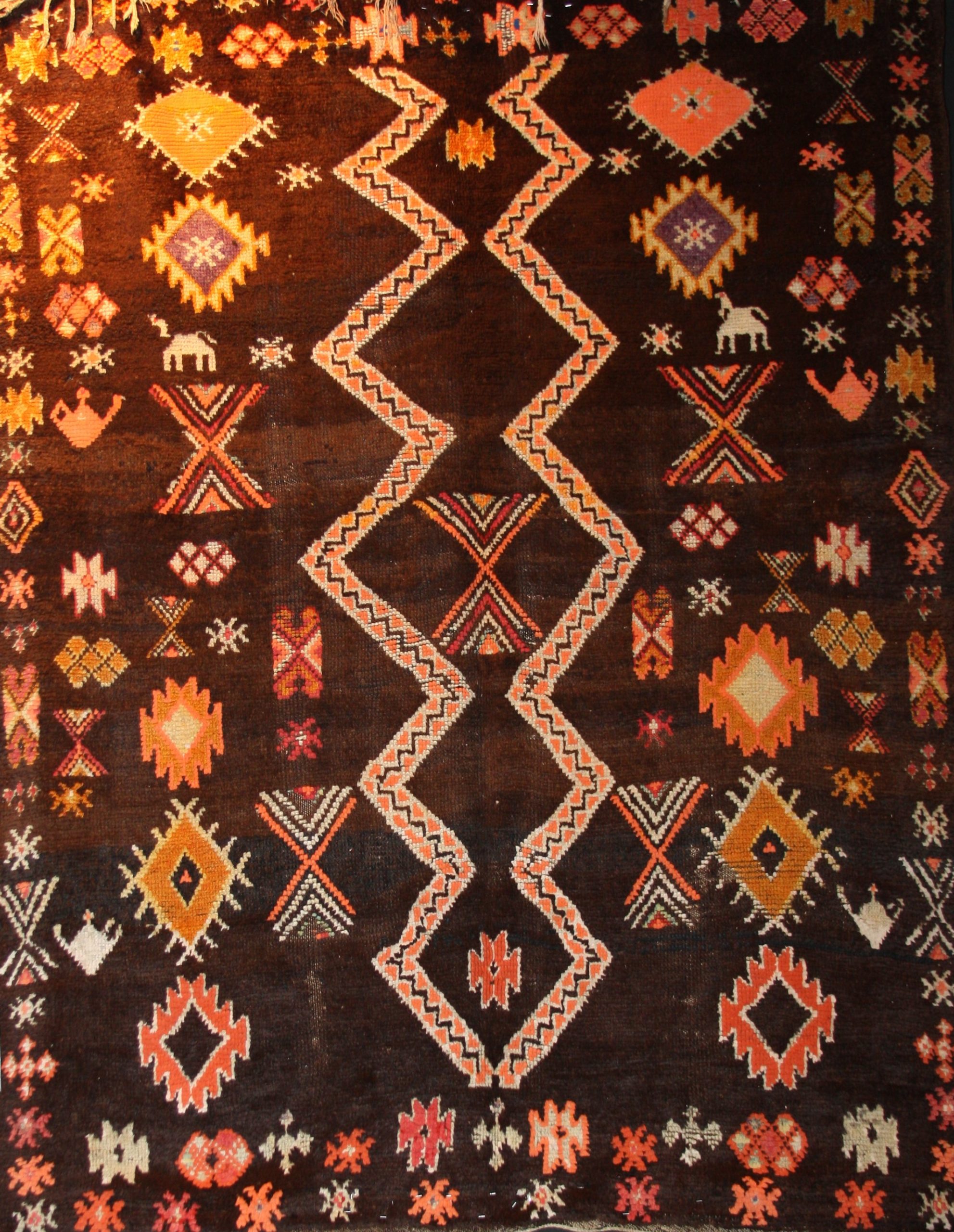 L’histoire des tapis marocains remonte au paléolithique, une période préhistorique caractérisée par le développement des premiers outils utilisés par l’homme. Des traces de motifs amazighs et de symbolisme tribal ont été trouvées dans les arts rupestres et la peinture rupestre datant de plusieurs milliers d’années. En l’absence de langage écrit, les tisserands de l’Antiquité enregistraient leurs mythes et légendes à l’aide de glyphes et de marques incrustées dans leurs tapis et dans des cavernes.